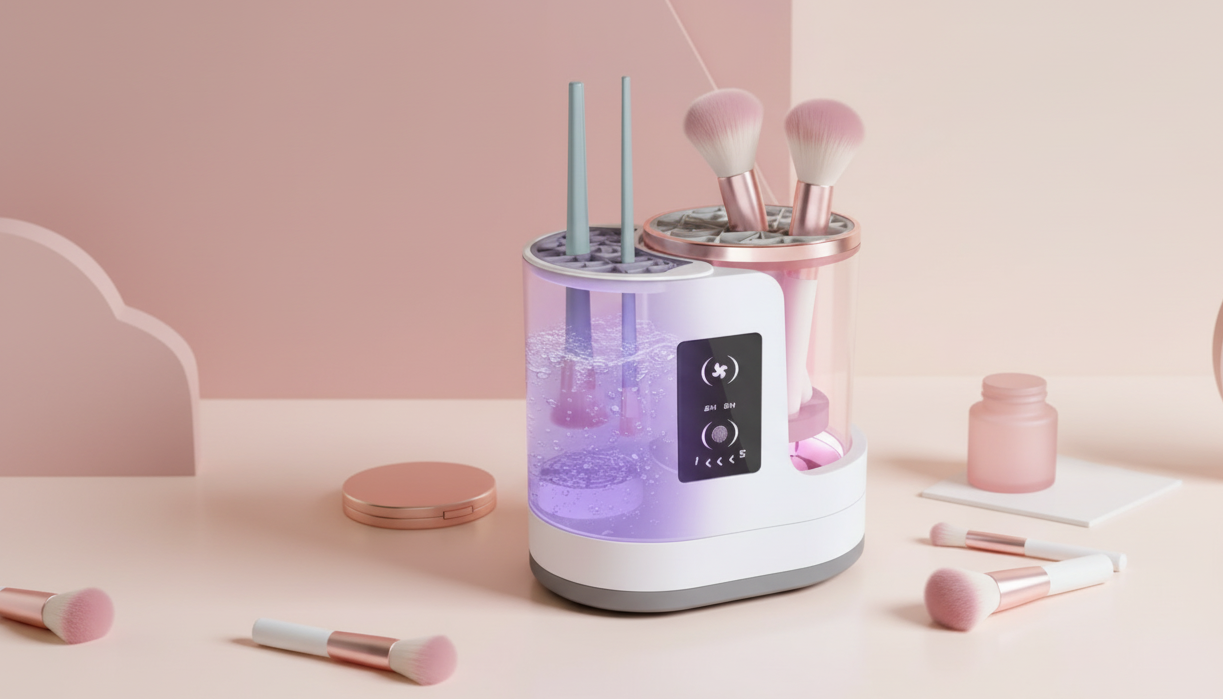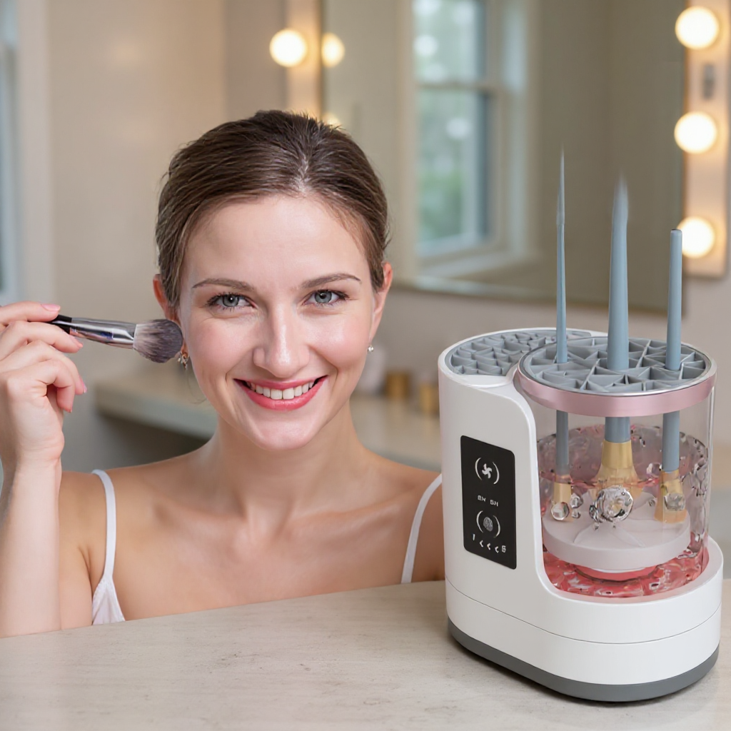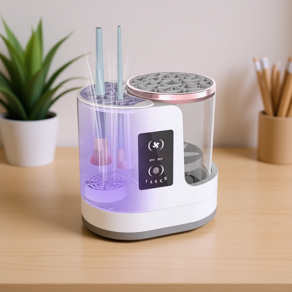 Our device uses a high-speed rotating water flow combined with a silicone cleaning column to remove up to 98% of makeup residue and dirt. After washing, brushes can be placed directly into the drying/disinfecting chamber for a safe, hands-free drying process.